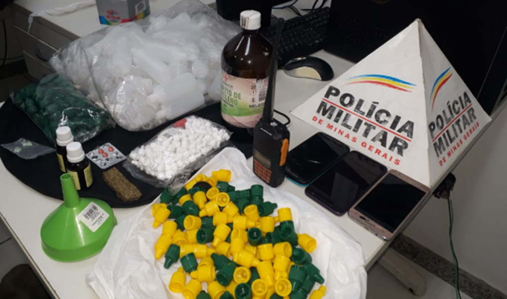 Também foi encontrado pela PM um vidro contendo cloreto de metileno e vários aditivos para sua mistura e centenas de embalagens plásticas, pote com capacidade para aproximadamente 100 ml, com bicos dosadores e tampas tipo rosca e duas essências de maracujá, usada na comercialização de "lança perfume".