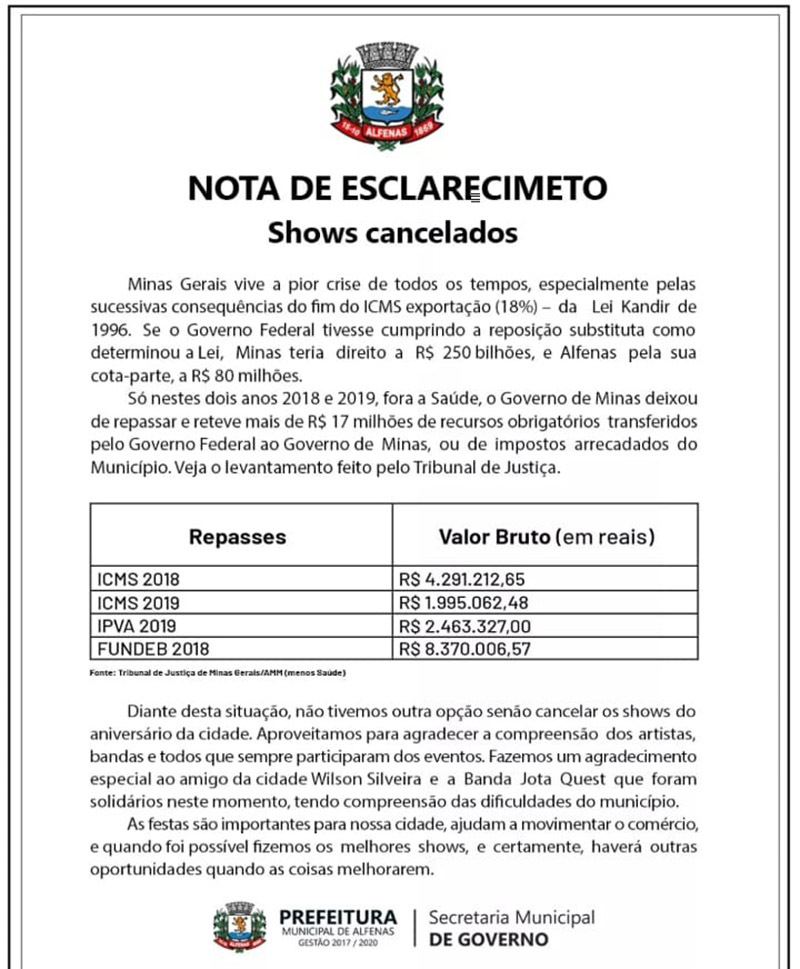 Na nota divulgada pela Prefeitura de Alfenas, a administração alega que Minas Gerais vive uma de suas piores crises, especialmente pelas consequências do fim do ICMS exportação (Lei Kandir), o que afeta a distribuição de recursos aos municípios. Segundo o governo local, o governo federal deixou de repassar R$ 250 bilhões a Minas como forma de reposição de perdas. Desses recursos, Alfenas teria direito a R$ 80 milhões, segundo a nota.