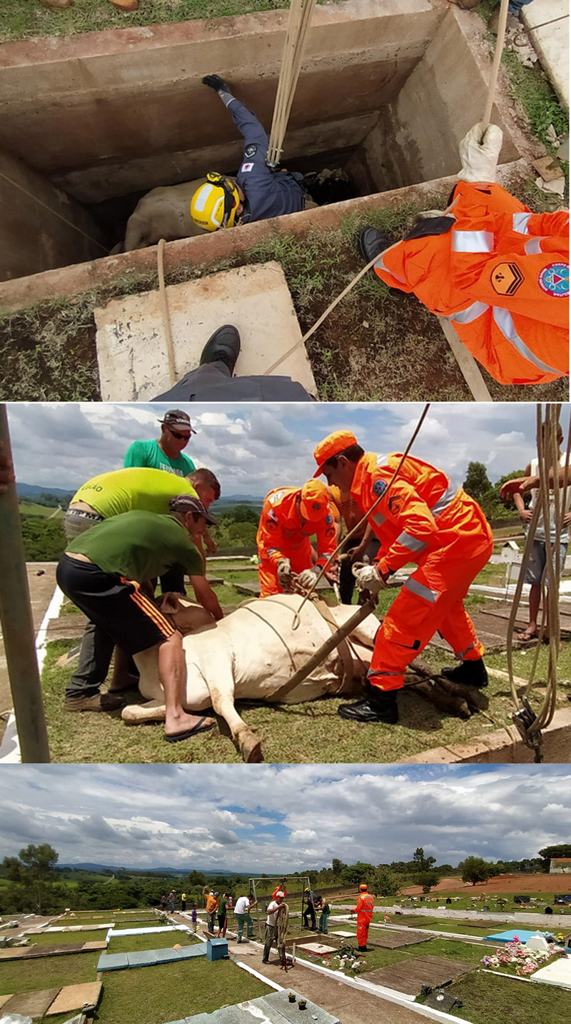 Uma vaca, pesando 400 Kg, foi resgatada pelo Corpo de Bombeiros de dentro de uma cova no cemitério do bairro Santa Clara, em Alfenas. A vaca, que estava desaparecida há três dias, foi retirada viva do local na manhã deste sábado.