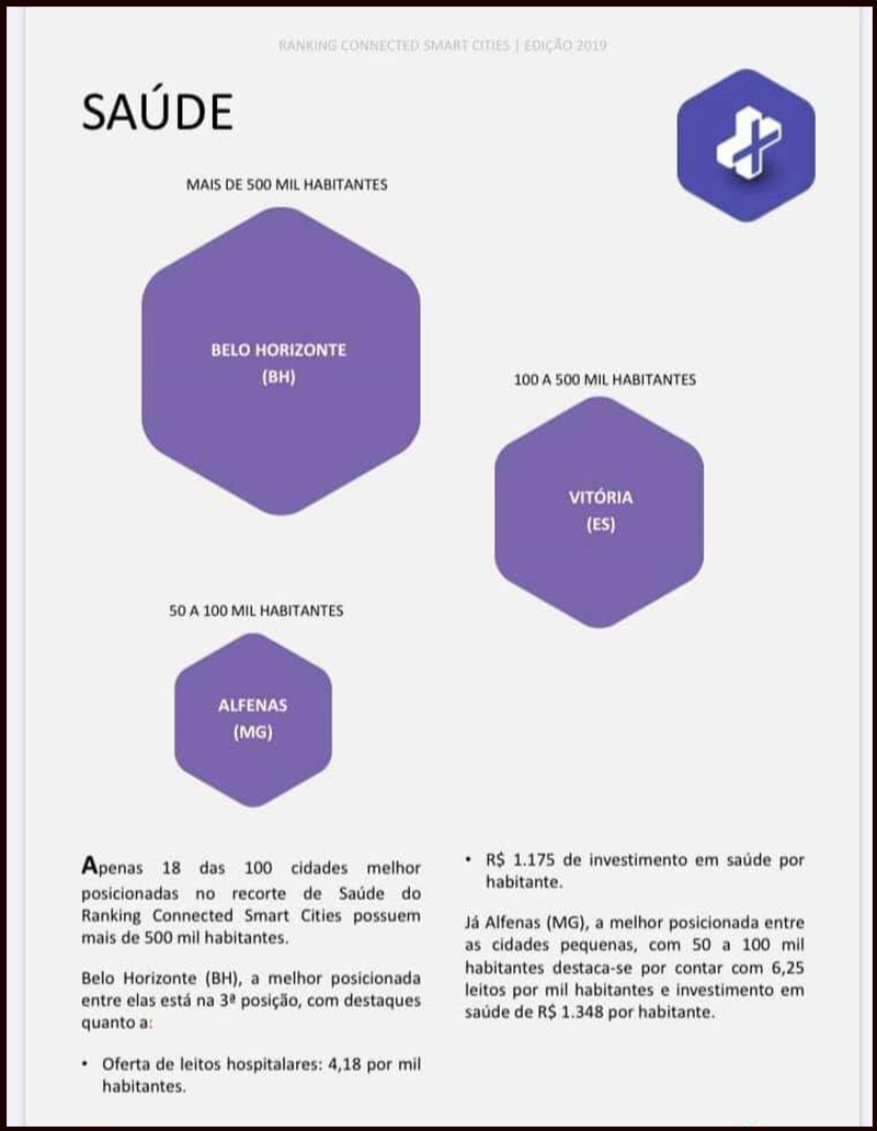 O setor de saúde (que considera a rede pública e privada) é dos 11 eixos que compõem o ranking geral, que apontou Campinas (SP) como a primeira colocada no ranking geral das cidades mais inteligentes e conectadas do país. Alfenas não aparece na relação entre as 100 cidades do país no ranking geral. Em Minas Gerais são apontadas Belo Horizonte – a melhor colocada entre as mineiras está na 13ª posição nacional -, Uberaba, Juiz de Fora, Uberlândia, Nova Lima, Pouso Alegre, Ipatinga, Montes Claros e Ouro Preto.