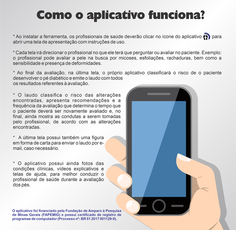 Para chegar à concepção do aplicativo, o grupo selecionou todos os itens necessários para a avaliação dos pés, disponibilizando-os em telas de celular a partir de um programa próprio para criar aplicativo. O aplicativo foi construído, passando por uma avaliação de pessoas especialistas na área. “Os especialistas deram sugestões para melhorias do aplicativo e só depois que estava totalmente aprovado por eles, foi possível experimentar nas pessoas que possuem diabetes”, relata.