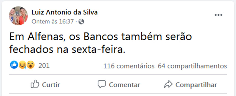 As agências bancárias de Alfenas não abrirão as portas na sexta-feira, um dia após o feriado municipal, dia do padroeiro da cidade. A medida foi anunciada pelo prefeito Luiz Antônio da Silva (Luizinho/PT) em suas redes sociais. Clique e confira o decreto.