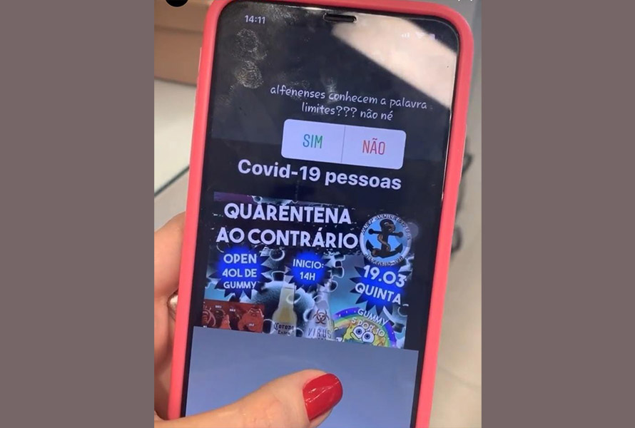 A festa “Quarentena ao contrário” trazia a mensagem Covid-19 pessoas, uma alusão a ao Covid-19, doença causada pelo vírus batizado com o nome científico Sars-CoV-2, o popular coronavírus.