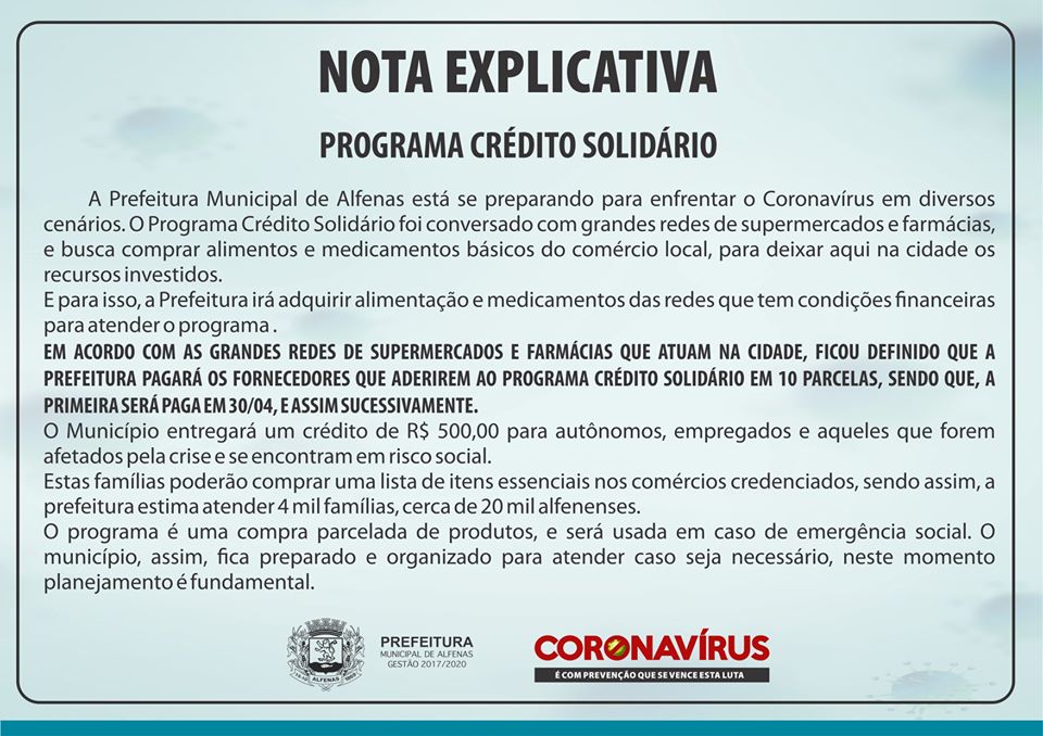 Um programa da Prefeitura de Alfenas prevê a injeção de R$ 4 milhões à famílias vulneráveis durante o período de situação de emergência devido a pandemia do coronavírus, decretado no último dia 17. O governo local quer atingir 4 mil profissionais que perderão a renda durante o período de crise. O projeto de lei, que autoriza a criação do programa Crédito Solidário, foi enviado à Câmara Municipal.