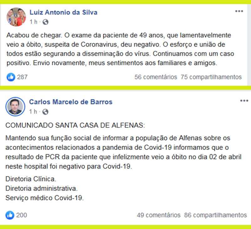 "Acabou de chegar. O exame da paciente de 49 anos, que lamentavelmente veio a óbito, suspeita de Coronavirus, deu negativo. O esforço e união de todos estão segurando a disseminação do vírus. Continuamos com um caso positivo. Envio novamente, meus sentimentos aos familiares e amigos”, diz a postagem feita pelo prefeito por volta de 12h30.