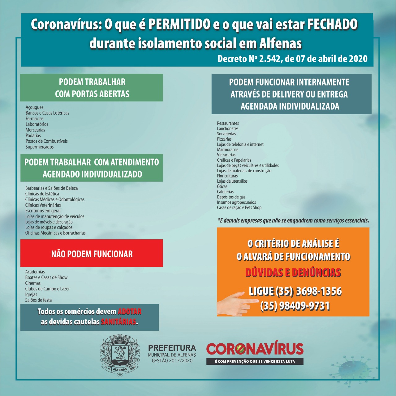 O Alfenas Hoje revelou, na segunda-feira, que o decreto a ser publicado obedeceria as recomendações do Ministério Público (MP), que apontou a necessidade de se observar as diretrizes do Comitê Estadual de Enfrentamento a pandemia do Covid-19. O acordo com os comerciantes teve que ser rediscutido, na segunda-feira, após as recomendações.