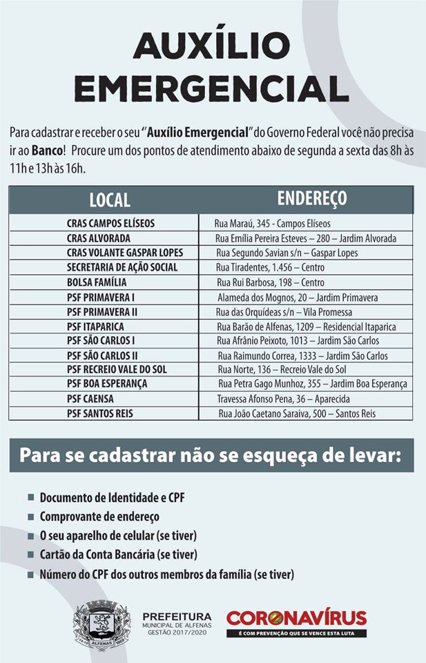 A Prefeitura de Alfenas vai instalar 14 pontos de atendimentos para orientações e cadastro do auxílio emergencial, concedido pelo governo federal. Quem tem direito ao benefício não precisa ir as agências bancárias e pode procurar uma das unidade de atendimentos espalhadas pela cidade. Confira ao final da reportagem os pontos de atendimento.