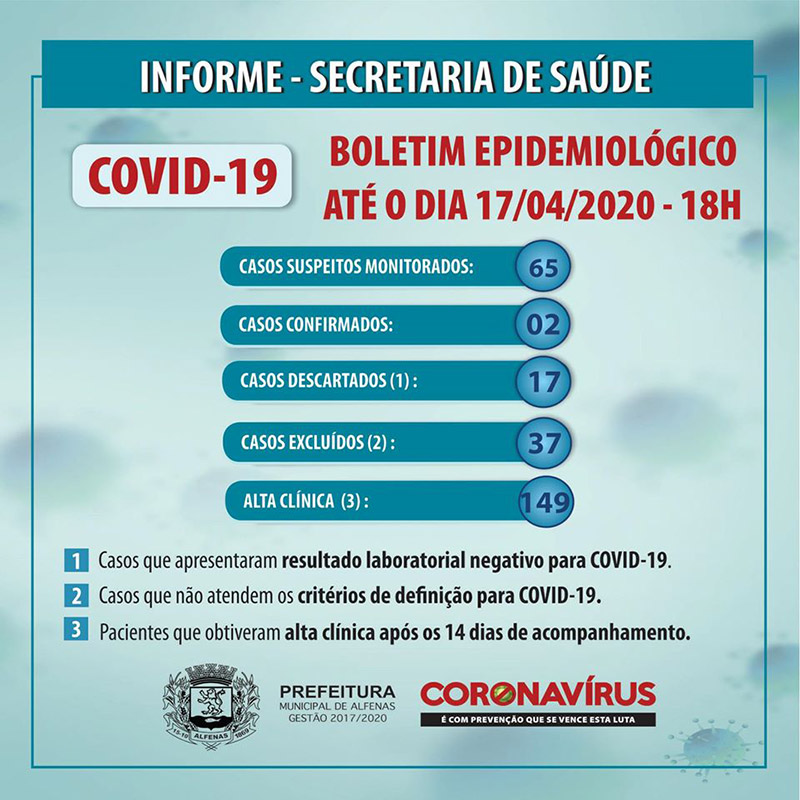 No total eram até sexta-feira 216 casos suspeitos já registrados, além de outros dois já confirmados. Não há mortes registradas de pacientes de Alfenas em decorrência da pandemia. A morte de uma paciente, com sintomas da doença, chegou a levantar suspeitas, mas o exame oficial descartou a possibilidade.