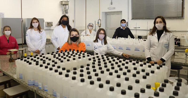 Foram doados cerca de 400kg de álcool em gel produzidos pela Faculdade de Ciências Farmacêuticas em parceria com o Instituto de Química, com certificação do Núcleo de Controle de Qualidade da Unifal. A produção foi realizada por meio de uma força-tarefa formada por professores, alunos de graduação e pós-graduação, técnicos de laboratório e colaboradores.