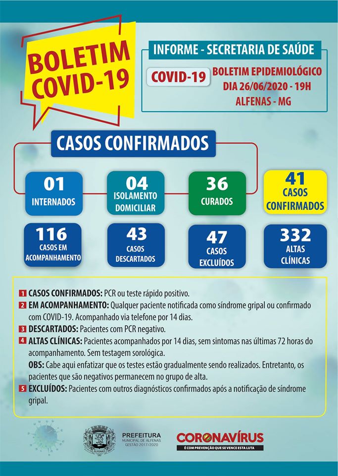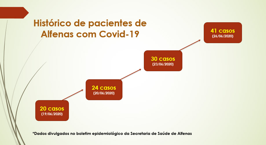 Esses dados referem-se aos registros históricos, ou seja os casos positivos desde o início da pandemia. Considerando apenas os pacientes de Alfenas apenas um segue internado. Outros casos estão em isolamento domiciliar sob acompanhamento das equipes de saúde. Trinta e seis já foram curados.