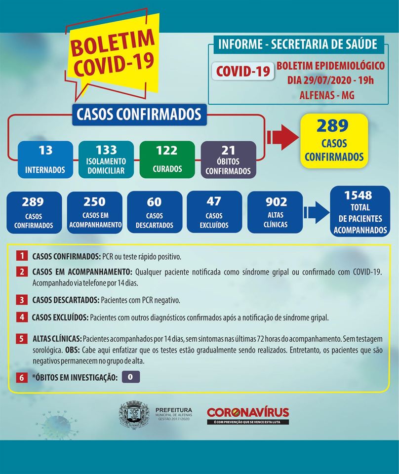 Em Alfenas já são 289 casos de Covid-19 desde o início da pandemia. Foram quase 100 casos confirmados em apenas dois dias, de segunda-feira para essa quarta-feira.