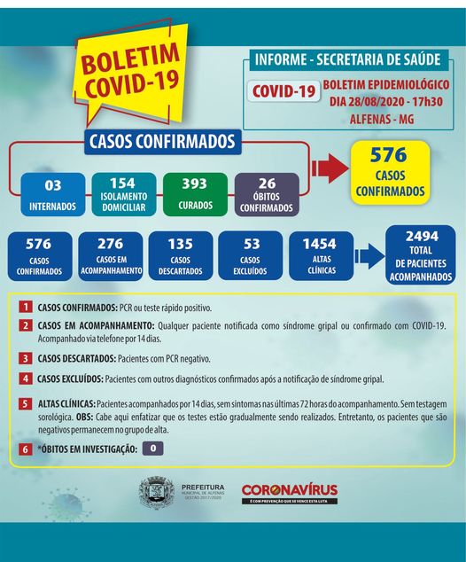 Alfenas chegou a 26 mortes em decorrência das complicações causadas pela Covid-19. A informação foi confirmada oficialmente no boletim epidemiológico, da Secretaria Municipal de Saúde, divulgado na final da tarde de sexta-feira.