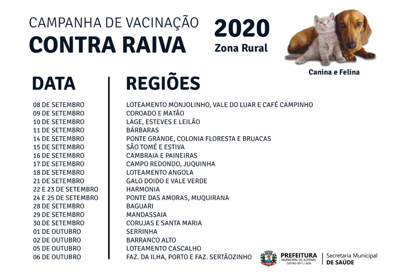 Teve início, na terça-feira (8 de setembro), a campanha de vacinação contra a raiva. A vacinação gratuita em Alfenas vai até 6 de outubro, sendo o dia 3 de outubro o último dia na área urbana, na Concha Acústica (Praça Getúlio Vargas). Confira a programação ao final da reportagem.