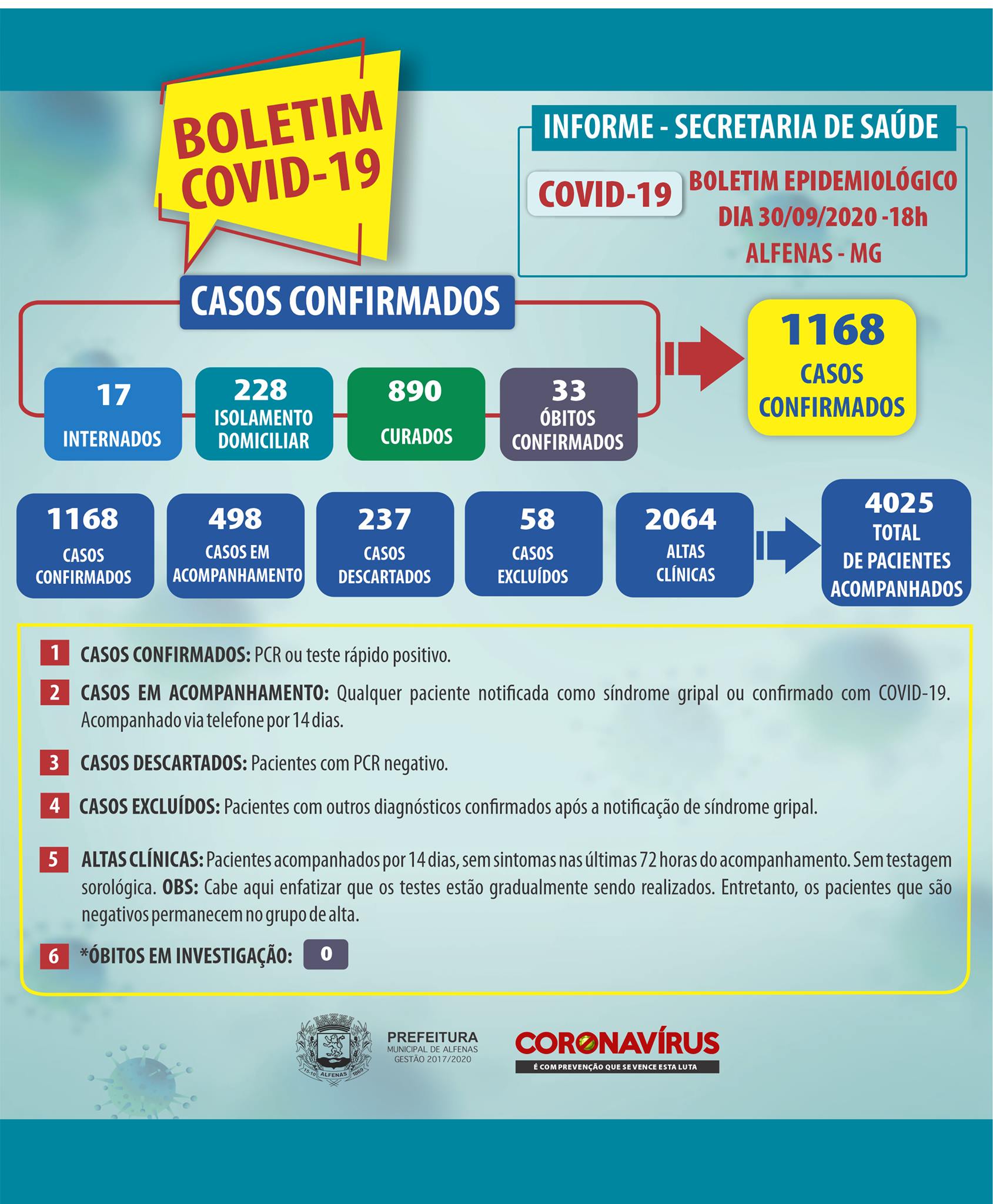 Mais duas mortes em decorrência da Covid-19 foram confirmadas em Alfenas no boletim epidemiológico, divulgado na noite de quarta-feira. Com isso, o número de mortes em Alfenas chegou a 33.