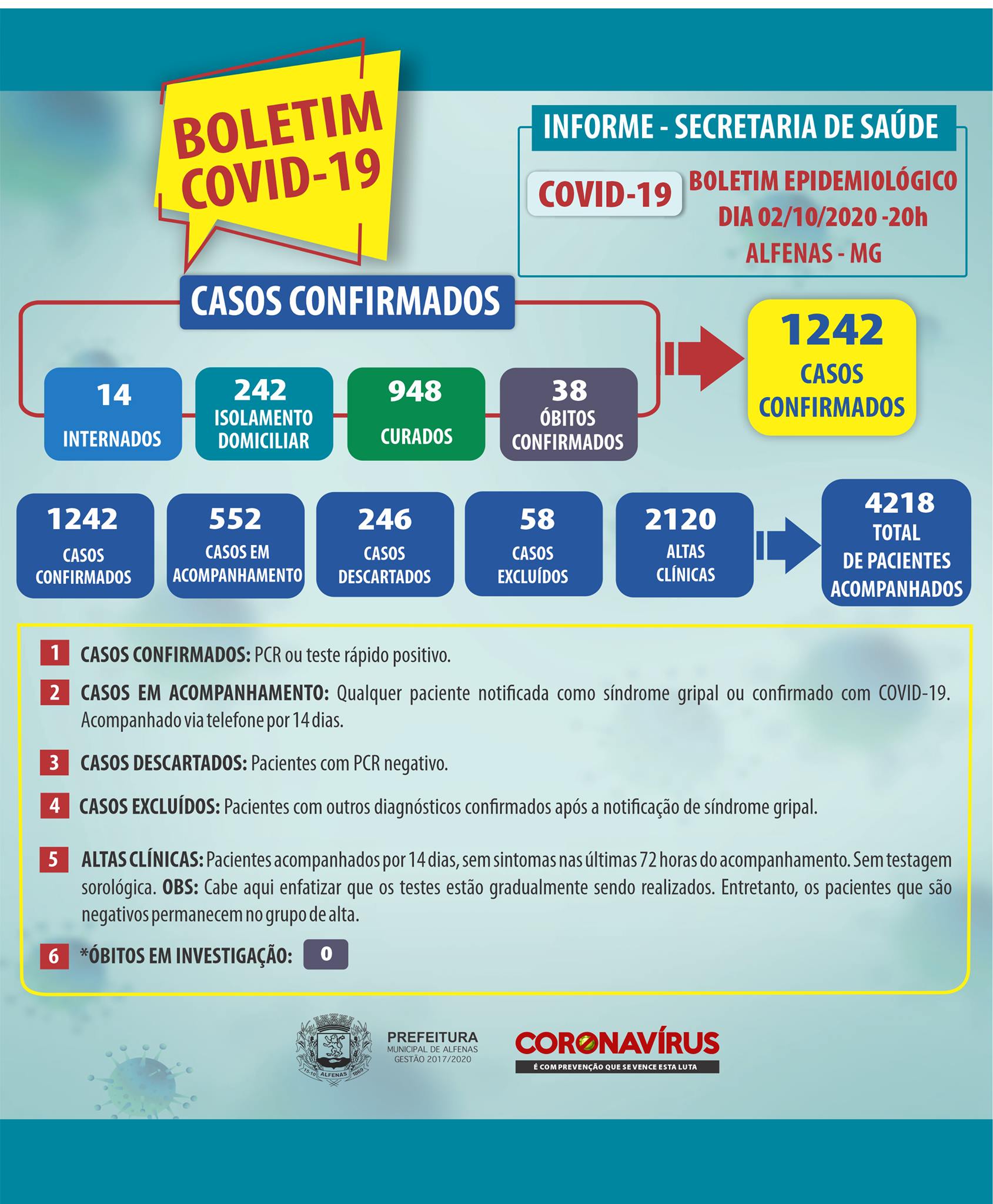 Cinco mortes, causadas pela Covid-19, foram registradas em apenas dois dias, de acordo com o boletim epidemiológico divulgado na noite de sexta-feira, dia 2. Com as novas confirmações o número de mortes em Alfenas subiu para 38.
