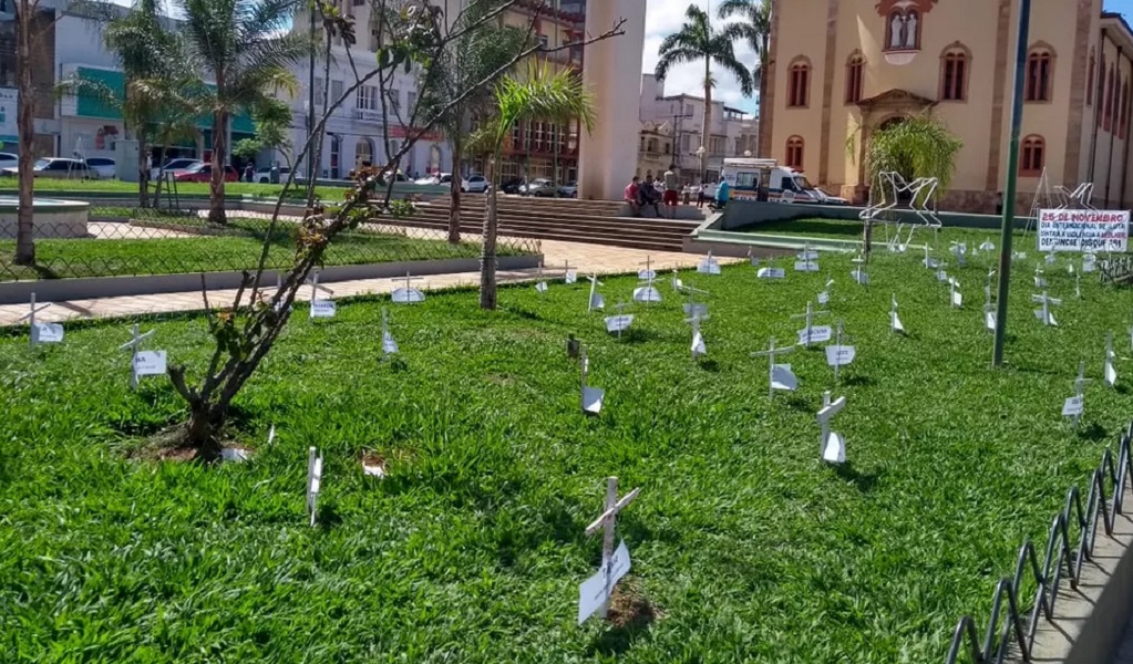 Para lembrar o Dia Internacional para a Eliminação da Violência contra as Mulheres foram colocadas 79 cruzes na Praça Getúlio Vargas. Cada cruz tem o nome de uma vítima de feminicídio em Minas Gerais durante a pandemia da covid-19.