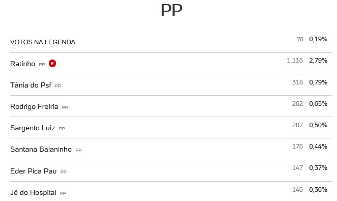 O PP elegeu o vereador Evanílson Andrade Pereira (Ratinho), mas não conseguiu nenhum suplente.