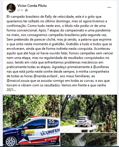 “Bi-campeão Brasileiro de Rally de Velocidade. Este é o grito que queríamos ter soltado no último domingo, mas só agora tivemos a confirmação. Como tudo neste ano, o título não podia vir de uma forma convencional. Após 7 etapas do campeonato e uma pandemia no meio, nos consagramos campeões brasileiros pela segunda vez”, postou o piloto de Alfenas nas redes sociais, campeão da Fórmula São Paulo em 2007. Em 2013, Victor Corrêa conquistou, em Barcelona (na Espanha), o título da Radical Master Euroseries.