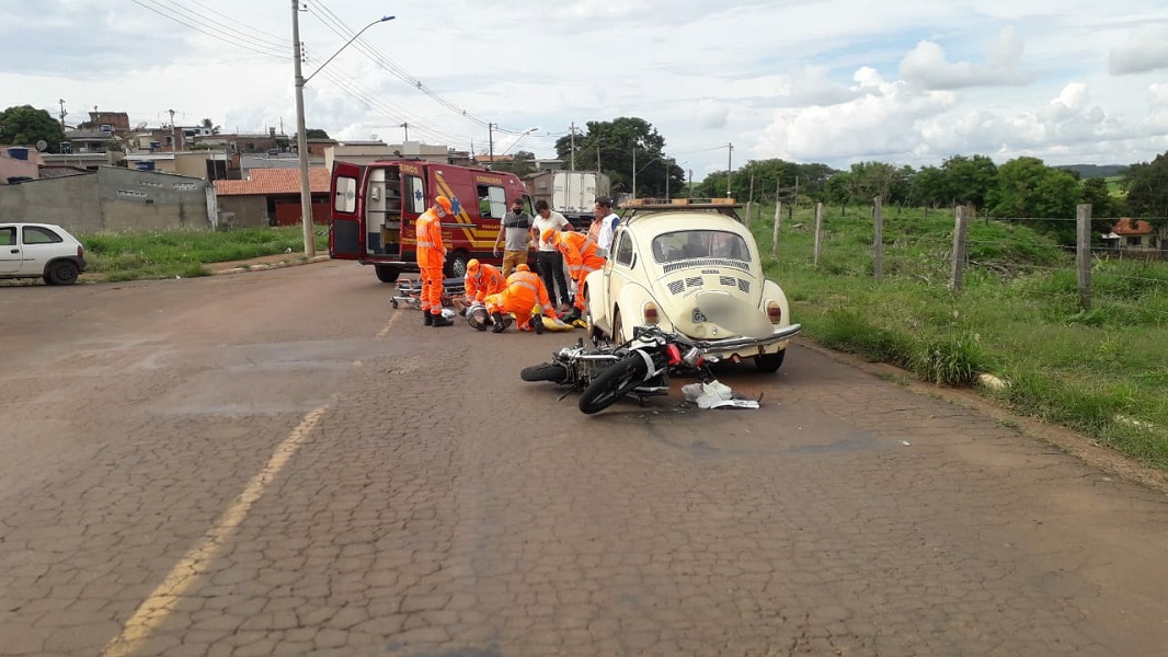 Um motociclista acabou se ferindo após colidir com automóvel VW Fusca. O acidente aconteceu na avenida Lincoln Westin da Silveira, bairro Jardim Primavera, na tarde de terça-feira.