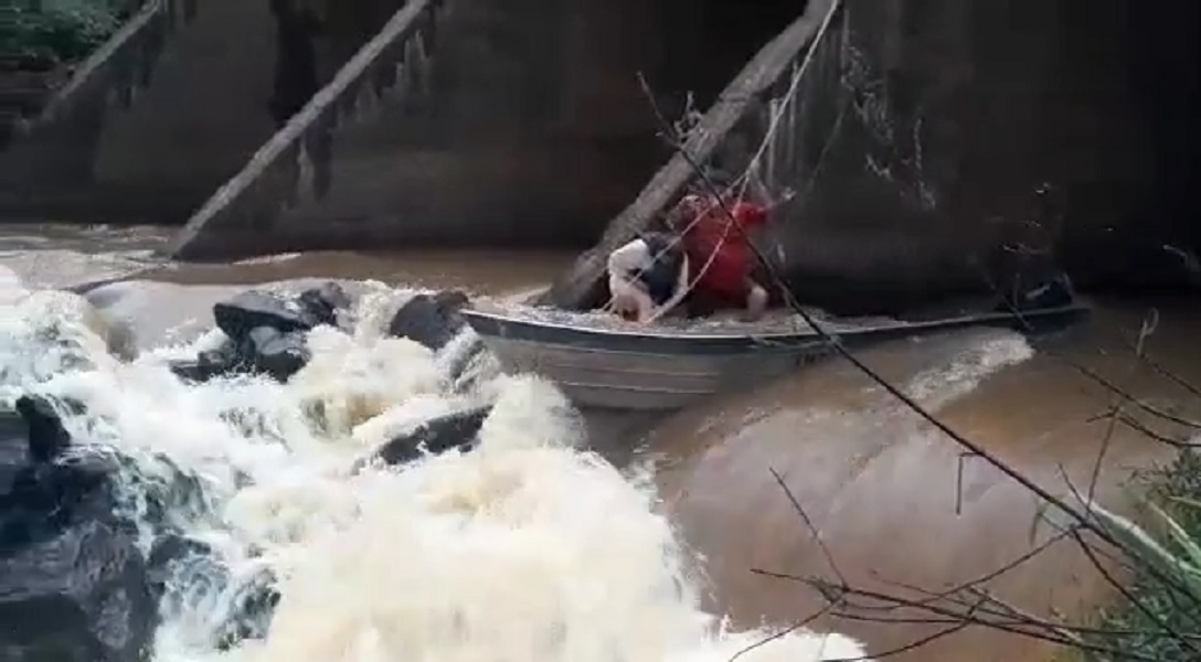 De acordo com o Corpo de Bombeiros, o barco tinha cinco pessoas que pescavam no local. Três delas conseguiram sair do rio e serem resgatados por populares, mas um homem de 68 anos e sua filha, de 43, foram arrastados pela correnteza. Os dois conseguiram se agarrar em uma pedra e ficaram ilhados.