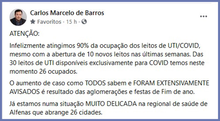O HSC é referência para o atendimento de pacientes de 26 cidades da microrregião de Alfenas. “Infelizmente atingimos 90% da ocupação dos leitos de UTI/COVID, mesmo com a abertura de 10 novos leitos nas últimas semanas. Dos 30 leitos de UTI disponíveis exclusivamente para covid temos neste momento 26 ocupados”, informou o médico.