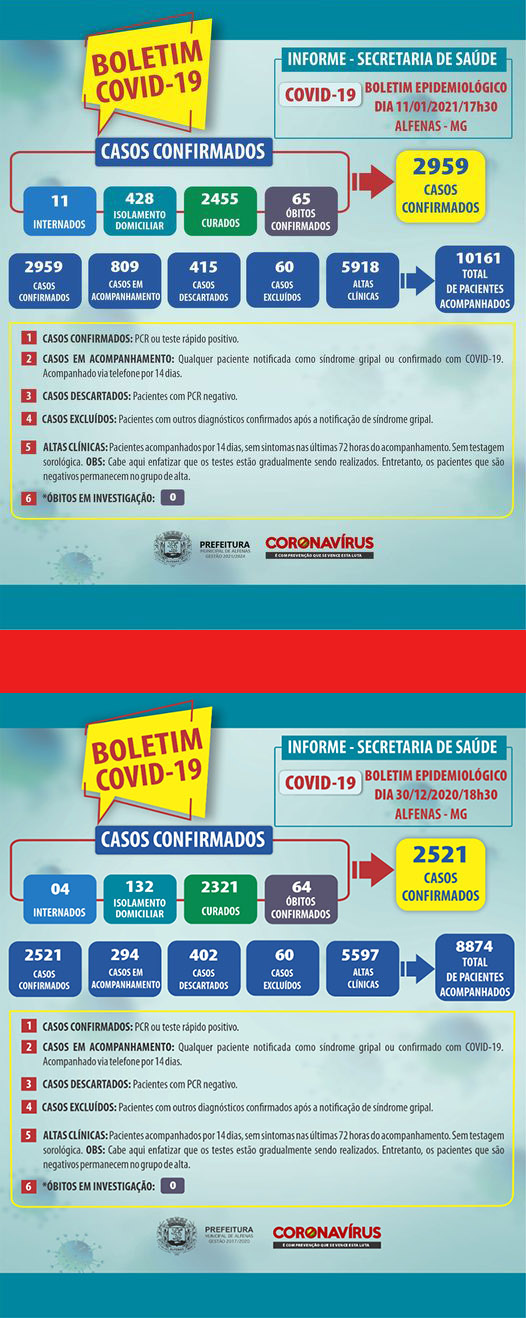 Os boletins epidemiológicos da Secretaria Municipal de Saúde, divulgados nos últimos 13 dias, mostram o avanço dos casos de pacientes com covid-19 em Alfenas. São 438 casos confirmados nesse período, subindo de 2.521 para 2.959, próximo de 3 mil confirmações desde o início da pandemia.
