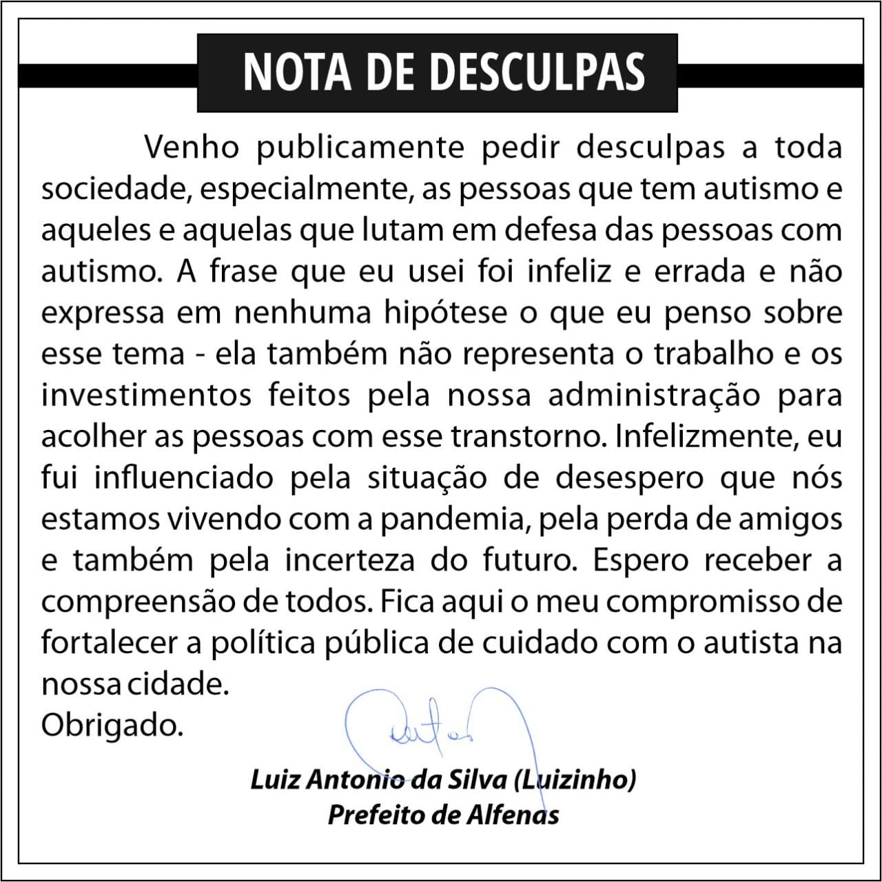 Nesse sábado, o prefeito de Alfenas pediu desculpas pelo que considerou como “infeliz e equivocada comparação” feita por ele na entrevista concedida na semana passada. Durante o programa Conversa com o Prefeito, da Rádio Pinheirinho, o prefeito participou ao lado da mãe de um autista de Alfenas e da coordenadora de políticas para inclusão em Alfenas. Confira abaixo o pedido de desculpas na gravação abaixo e também a nota de desculpas.