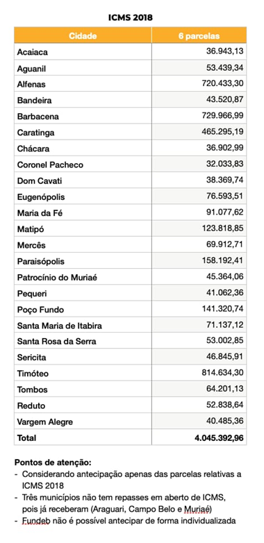 As parcelas do ICMS fazem parte do acordo feito entre o Executivo estadual e a Associação Mineira de Municípios (AMM), para quitação de 33 parcelas referentes ao ICMS, IPVA e Fundeb dos anos de 2018 e 2019. Os débitos foram deixados pela administração passada. A quitação do acordo irá regularizar o repasse atrasado de R$ 7 bilhões junto aos municípios e ao Fundeb. Os valores antecipados pelo governo serão descontados no final.