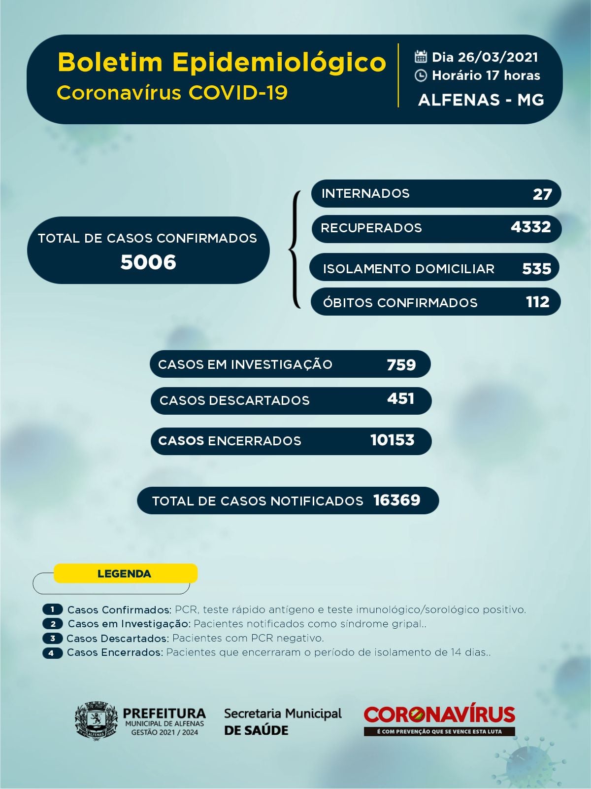 Já são mais de 5 mil casos confirmados de covid-19 em Alfenas desde o início da pandemia. O boletim epidemiológico da Secretaria Municipal de Saúde, publicado na sexta-feira, mostra 5.006 casos confirmados de covid-19 no histórico da pandemia no município.