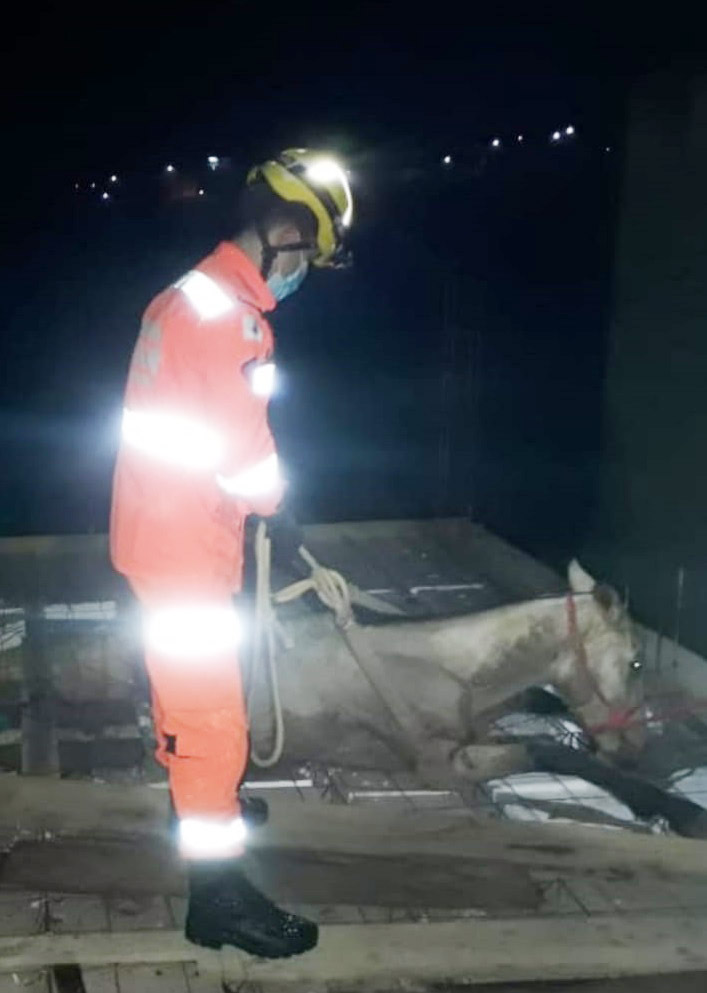 Por volta das 2h da manhã desta segunda-feira, o Corpo de Bombeiros de Alfenas foi acionado para atender um animal em perigo. Por motivos desconhecidos, um cavalo caiu em uma laje ainda em obras.