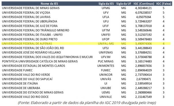 A Unifal (Universidade Federal de Alfenas) aparece na 9ª colocação em um ranking estadual que considera dados oficiais do Ministério da Educação (MEC). O Índice Geral de Cursos 2019 (IGC) foi divulgado pelo Instituto Nacional de Estudos e Pesquisas Educacionais Anísio Teixeira (Inep), vinculado ao MEC.