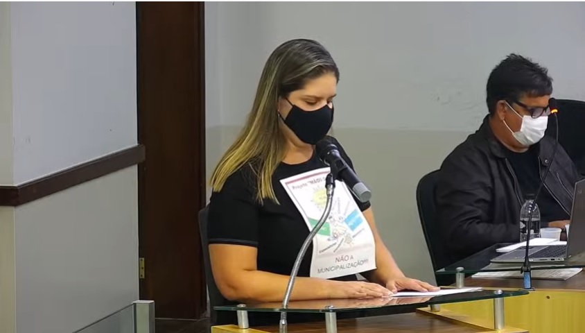 A tribuna da Câmara Municipal foi usada, na noite de segunda-feira, pela professora Thalita de Carvalho Bráulio Mendonça, da Comissão de Representantes das quatro escolas estaduais que serão afetadas pela municipalização do Ensino Fundamental I (1º ao 5º ano).