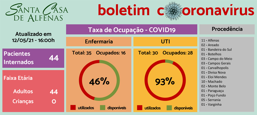 Na enfermaria, onde são 35 vagas, a taxa de ocupação está em 46%, O total de pacientes é 44, sendo 11 de Alfenas.