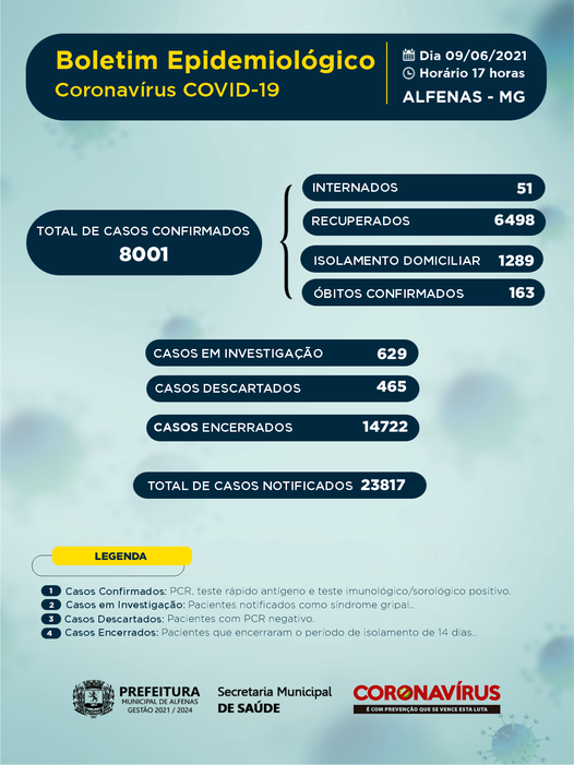 Novo boletim mostra números preocupantes com 1.289 pessoas em isolamento domiciliar.