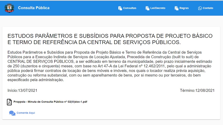 A consulta pública está aberta até 12 de agosto, mas pode ser prorrogada por mais 30 dias. Após finalizada essa etapa, a Secretaria Municipal de Desenvolvimento Econômico, Indústria, Comércio e Ação Regional, responsável pelo processo, promoverá uma audiência pública para debater o tema, de acordo com o próprio edital.