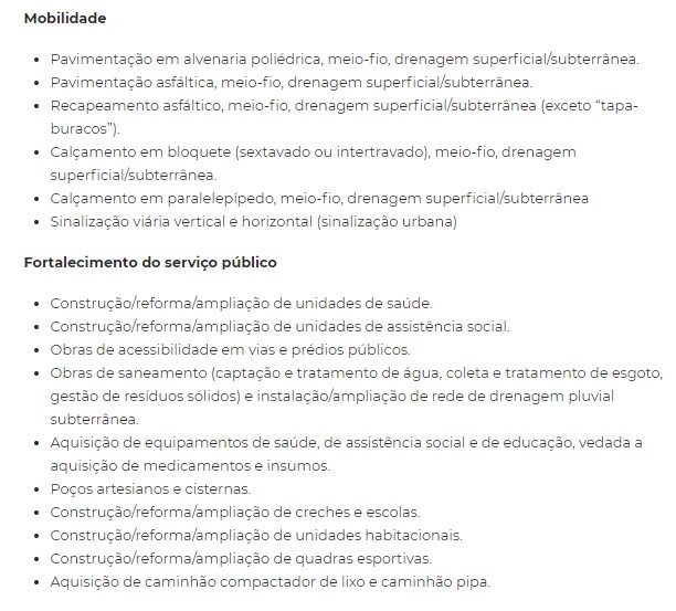 As prefeituras devem investir o dinheiro apenas em áreas que estão previstas no acordo, como pavimentação e recapeamento asfáltico, sinalização urbana, além de reforma de unidades de saúde, creches e escolas.