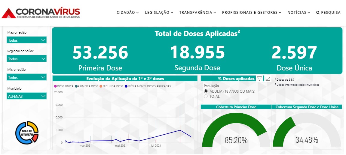 O site da SES/MG mostra ainda que a cobertura vacinal com a primeira dose chegou a 85,2%, enquanto que - com a 2 dose - atingiu 34,4%. Esses percentuais referem-se apenas a população a partir de 18 anos, uma vez que, abaixo disso, ainda não houve início da imunização em Minas Gerais. Se considerada a população total, esses percentuais caem para 66,4% e 26,8%, respectivamente.