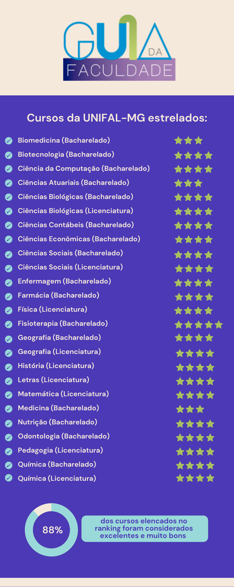 O ranking anual Guia da Faculdade elencou 25 cursos da Unifal (Universidade Federal de Alfenas) na edição 2021, lançada em 24 de outubro. Desses, 88% foram considerados como excelentes ou muito bons. Entre os destaques está o curso de Fisioterapia, que obteve a pontuação máxima na avaliação: 5 estrelas.