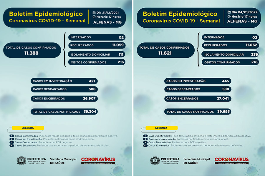 No documento do dia 21 eram 111 pessoas em isolamento domiciliar. Esse número subiu para 339 no último boletim, divulgado dia 4 de janeiro. É um crescimento de 205,4% em 14 dias. São casos de pacientes que testaram positivo para a covid-19, mas não necessitam de internação hospitalar. Eles são monitorados pelas equipes de saúde da Prefeitura de Alfenas.