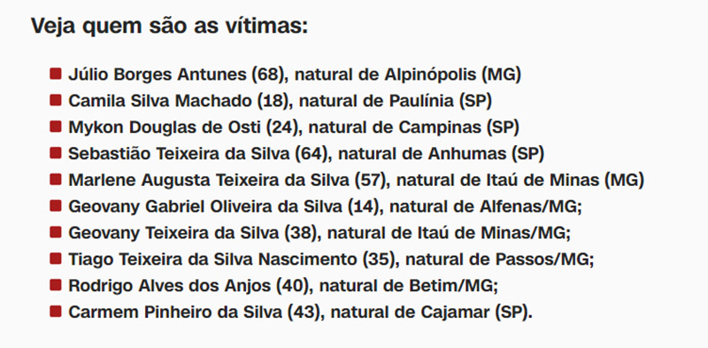 A reportagem havia citado que haviam dois adolescentes de 14 anos, nascidos em Alfenas, entre as vítimas. A informação foi corrigida.