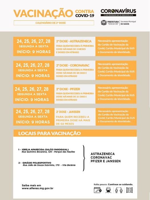 Já para a segunda dose a vacinação também será de segunda a sexta-feira. A aplicação da vacina será no Ginásio Poliesportivo e na Igreja Aparecida (Salão Paroquial), sempre a partir das 9h da manhã.