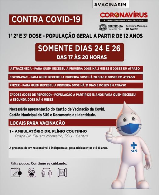 O cronograma para aplicação da vacina contra a covid-19, no decorrer desta semana, foi publicado na quinta e sexta-feira. São três cronogramas: para quem vai receber a 2ª dose, para quem receberá a dose de reforço e para crianças (5 a 11 anos) com comorbidades e sem comorbidades a partir dos 10 anos.
