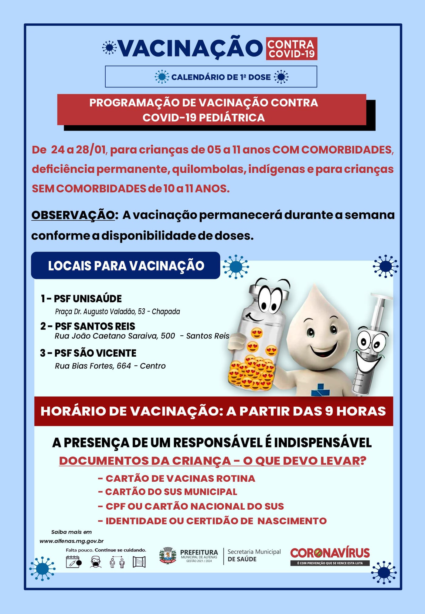 Com 26% da população vacinada com a dose de reforço, a programação prevê a imunização para esse grupo de pessoas na segunda e quarta-feira, das 17h às 20h. O local será o Ambulatório Dr. Plínio Coutinho, no centro de Alfenas.