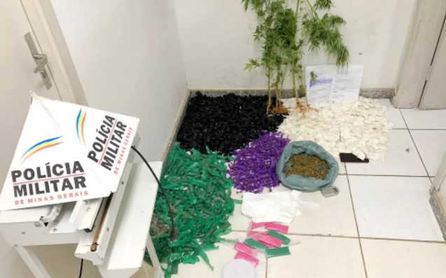 A prisão das drogas foi na zona rural de Alfenas, próximo ao bairro Santa Clara. Também foram apreendidos um aparelho celular, duas balanças, um caderno de contabilidade e uma máquina de embalar drogas. Abaixo, foto divulgada pela PM.