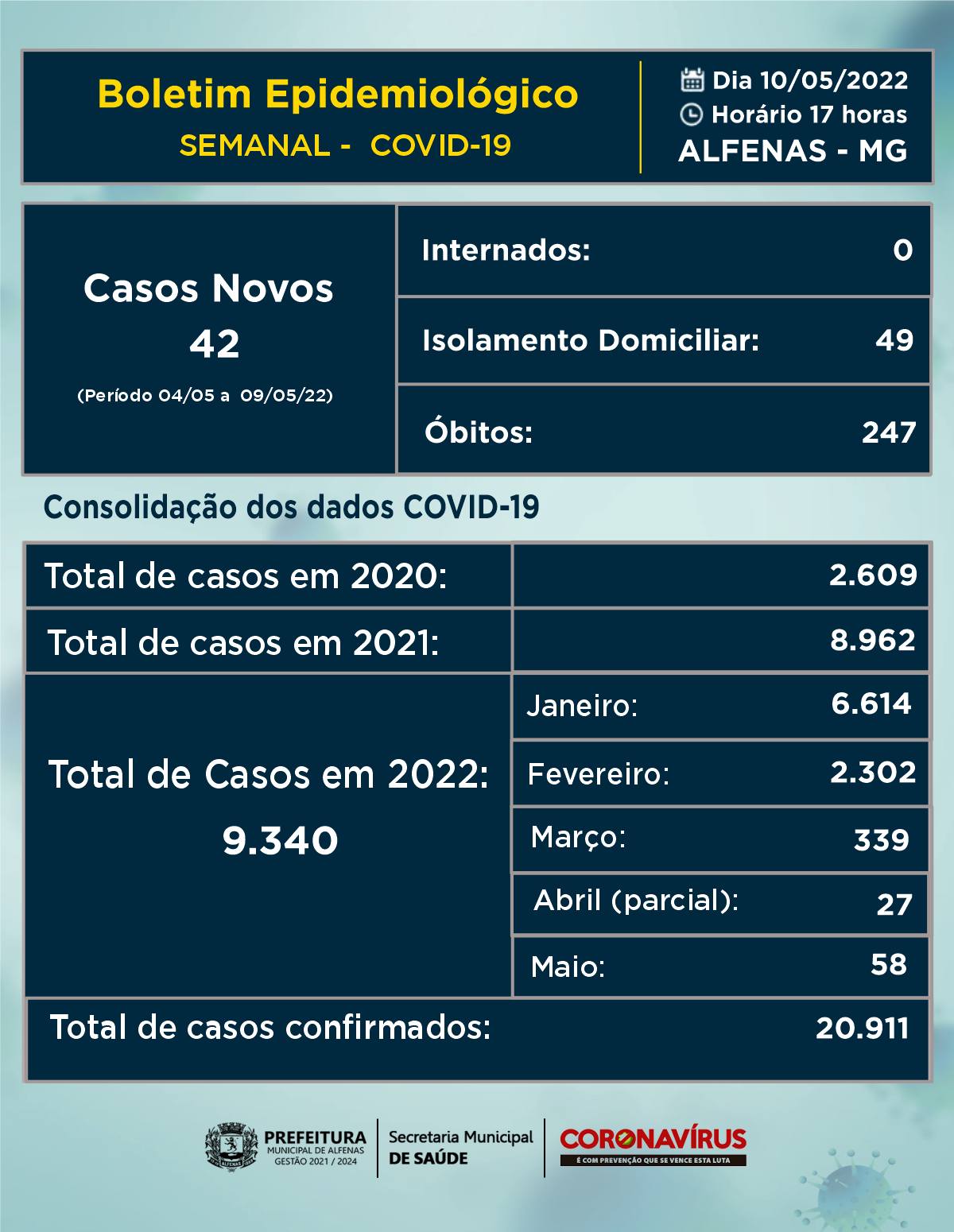 Em Alfenas, o número de pessoas em isolamento domiciliar saltou para 49 nas últimas semanas, de acordo com o boletim divulgado pela Secretaria Municipal de Saúde. São 42 novos casos entre 4 a 9 de maio. No entanto, as internações continuam zeradas.