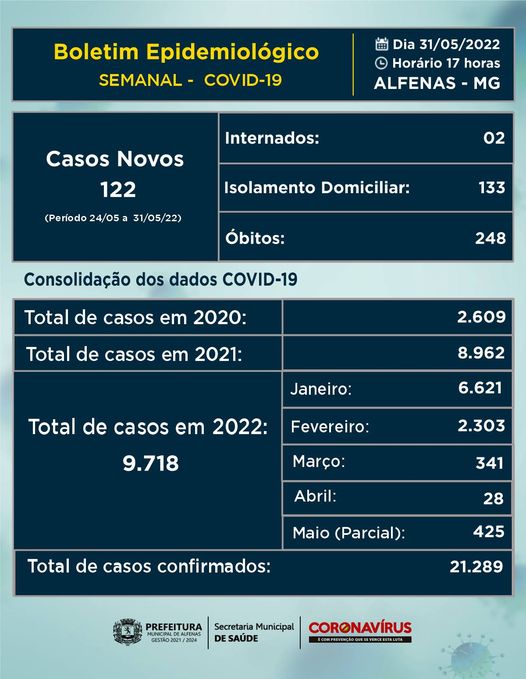 Alfenas segue com duas internações e 133 casos de isolamento domiciliar. São 9.718 casos oficiais já registrados esse ano contra 8,962 no decorrer de 2021. Em maio já são 425 registros, bem acima dos 28 do mês anterior.