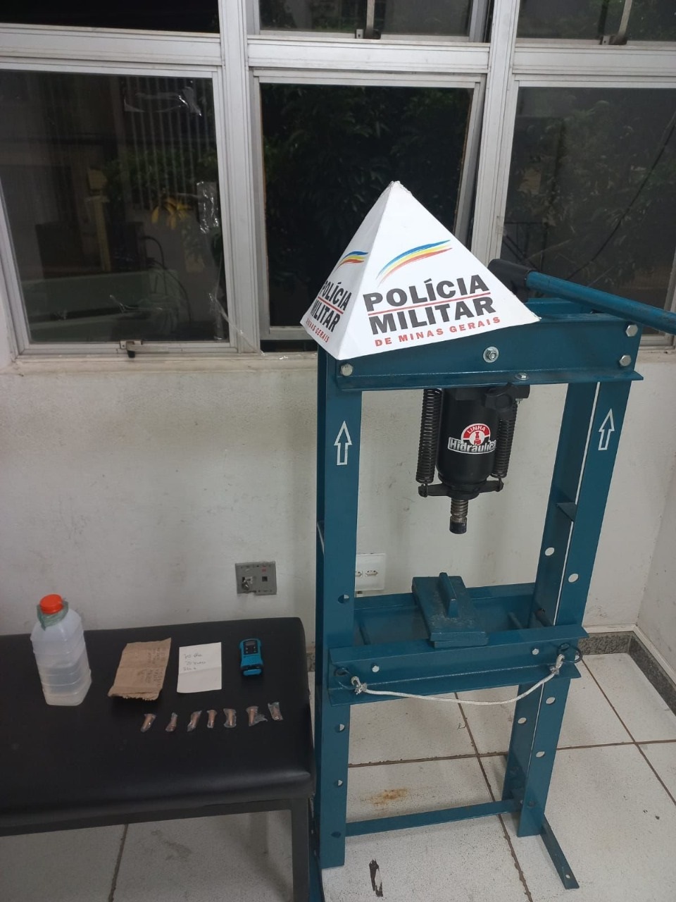 Segundo a corporação, foi feita uma operação antidrogas pela equipe do Tático Móvel, que resultou na apreensão de drogas, anotações de contabilidade, rádio de comunicação, além de uma prensa hidráulica. Um suspeito foi identificado durante a ocorrência. Abaixo, foto divulgada pela PM.