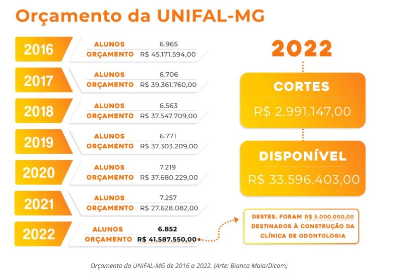 O orçamento aprovado para 2022 foi de R$ 41.587.550,00. Desse valor, R$ 5 milhões foram concedidos especificamente para a construção da nova Clínica de Odontologia, restando R$ 36.587.550,00 para aplicação nas outras áreas. Com o corte, os recursos disponíveis caíram para R$ 33.596.403,00. Em 2016, esse valor era de R$ 45.171.594,00.