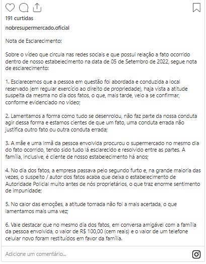 Após a repercussão, o Supermercado Nobre divulgou uma nota, no instagram, na qual se posiciona sobre o caso. O estabelecimento lamenta a forma como "tudo se desenrolou", reconhecendo que a atitude tomada não foi a mais acertada. Diz ainda que, em conversa amigável com a família, restituiu o valor de R$ 100 e referente ao aparelho celular. Confira a nota na sequência.