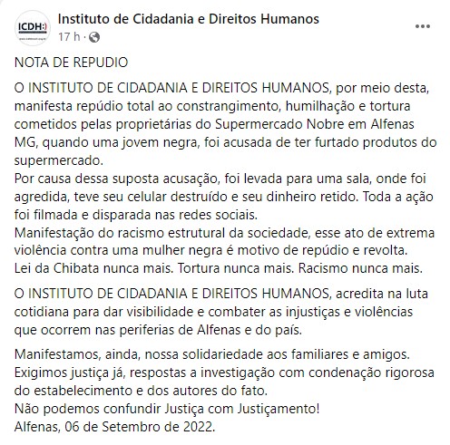 O Instituto de Cidadania e Direitos Humanos publicou uma nota de repúdio em relação ao episódio. “Manifesta repúdio total ao constrangimento, humilhação e tortura cometidos pelas proprietárias do Supermercado Nobre em Alfenas MG, quando uma jovem negra, foi acusada de ter furtado produtos do supermercado”, diz a nota, que pode ser conferida na íntegra logo abaixo.